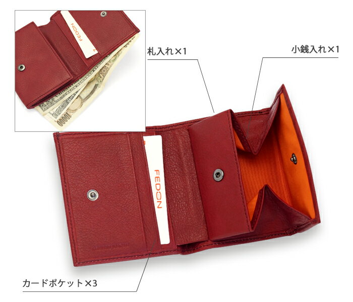 手のひらサイズながら、小銭入れ・カードポケット3つ・札入れをしっかり完備。